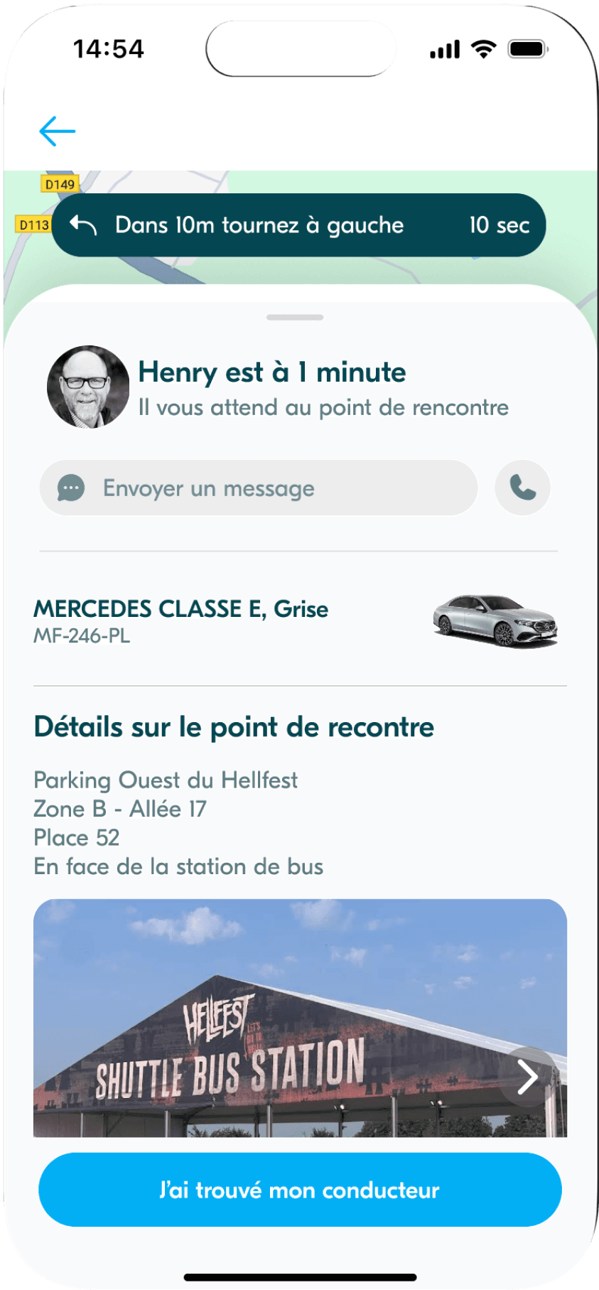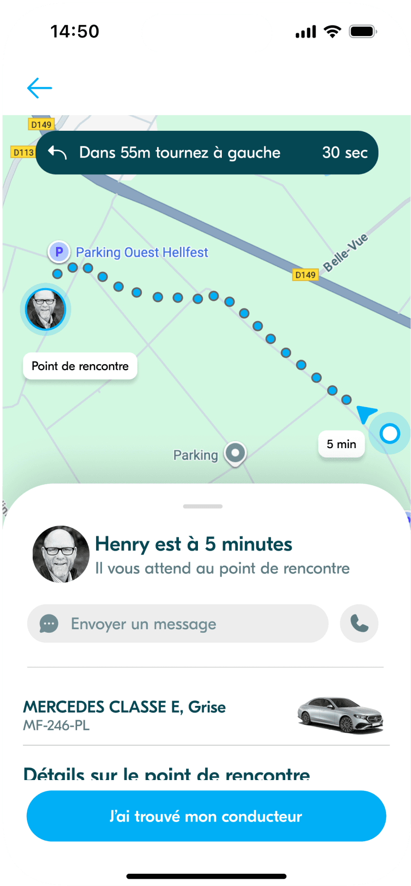 Nous avons intégré une carte interactive pour faciliter la rencontre avant le départ avec la position du conducteur et les photos du lieu de rencontre. Toutes ces fonctionnalités impliqueront également de repenser l'expérience côté conducteur.