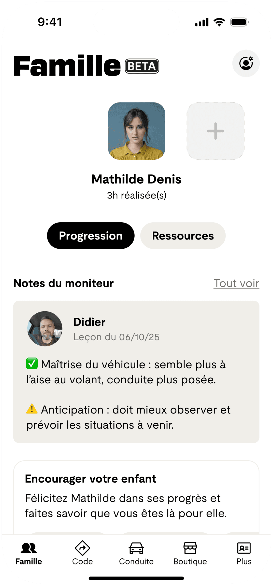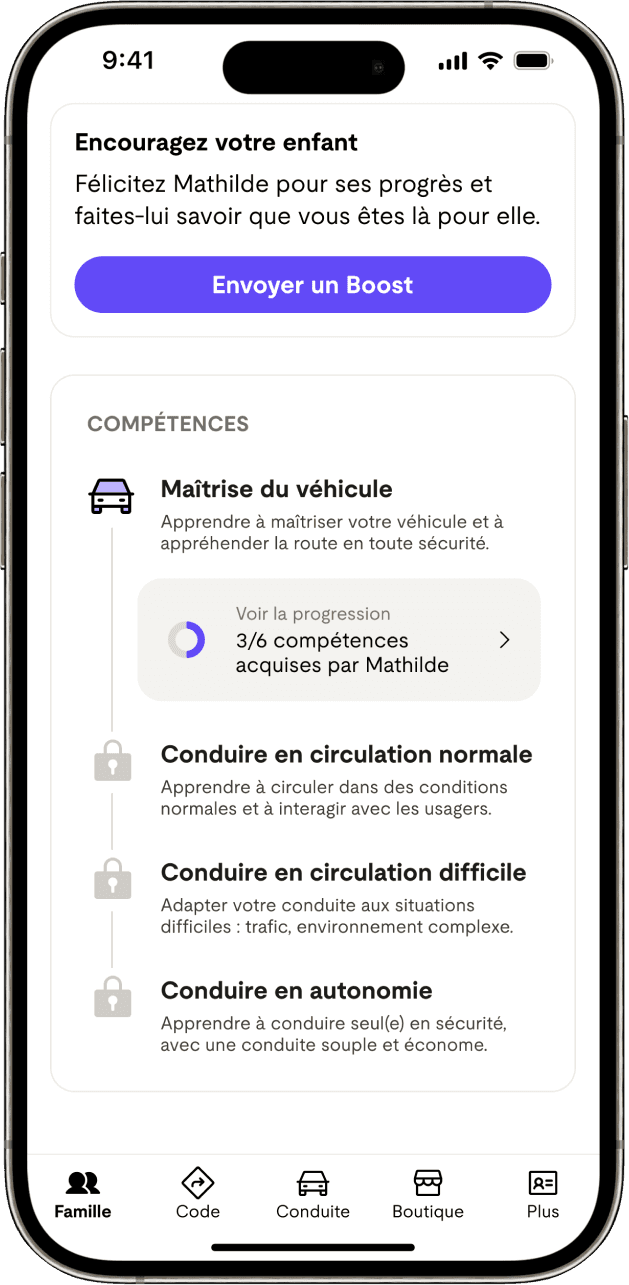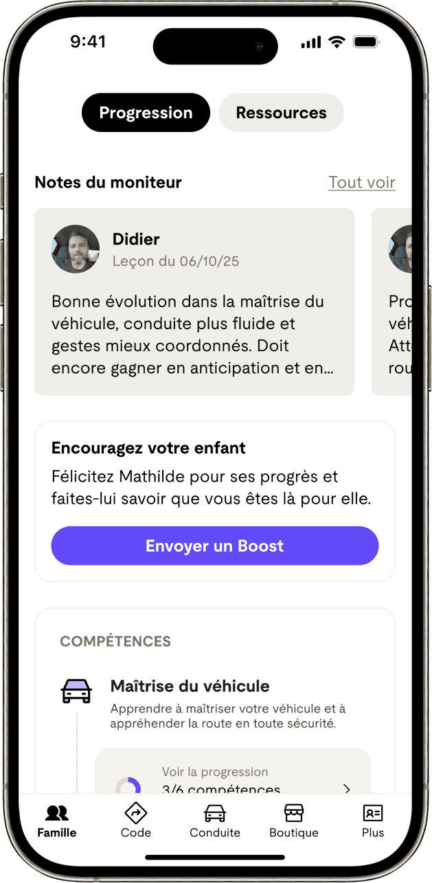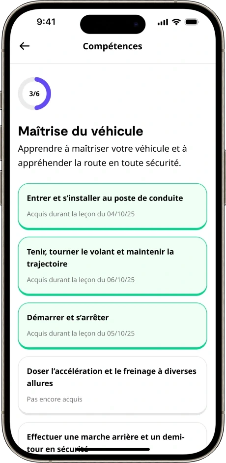 Le parent a aussi l'opportunité de voir la progression de son enfant grâce aux compétences que l'enfant débloque au fur et à mesure de ses heures de conduite.