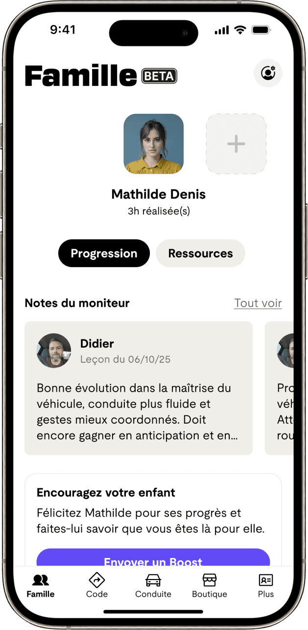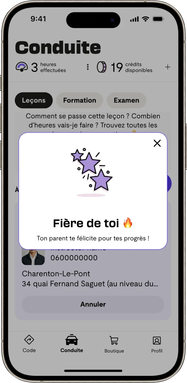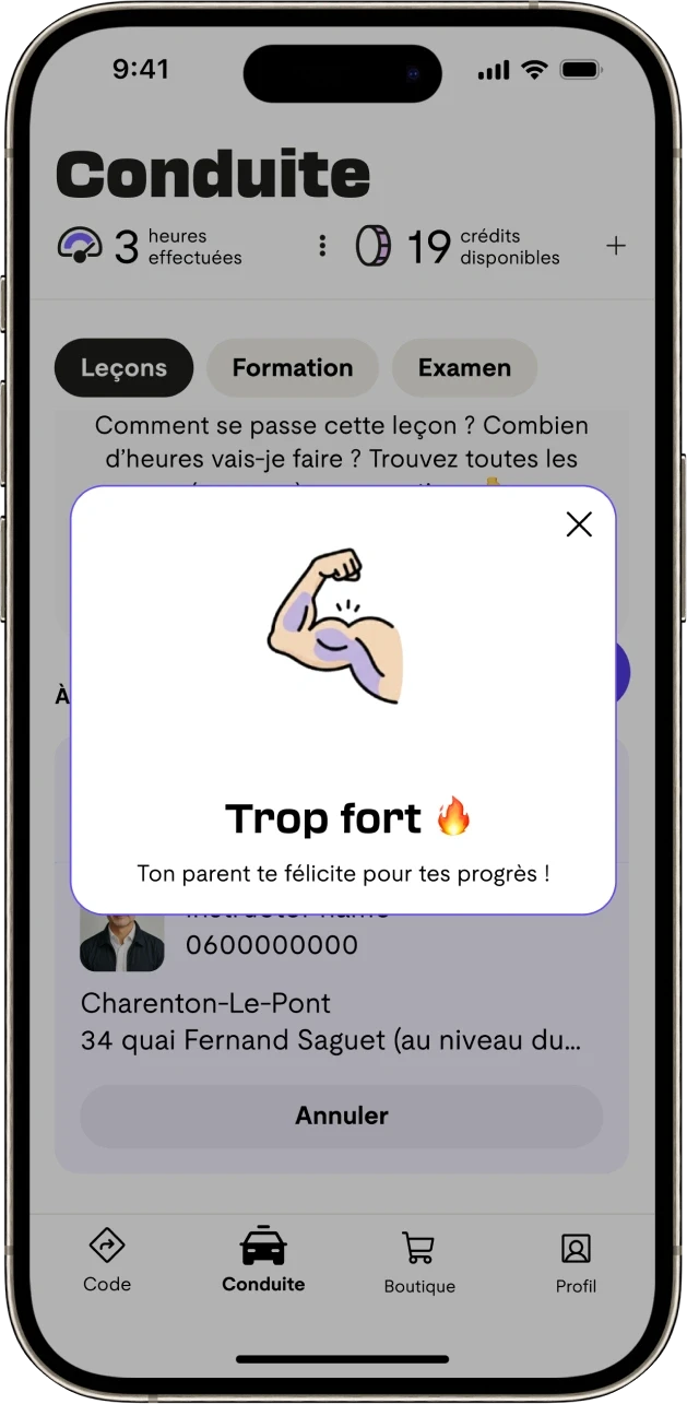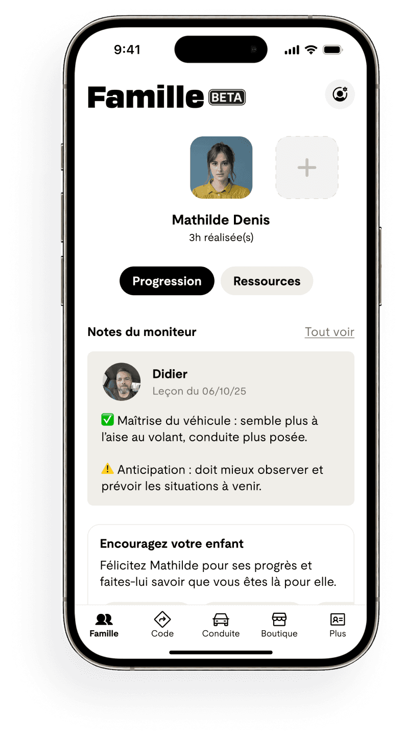Le parent a aussi l'opportunité de voir la progression de son enfant grâce aux compétences que l'enfant débloque au fur et à mesure de ses heures de conduite.