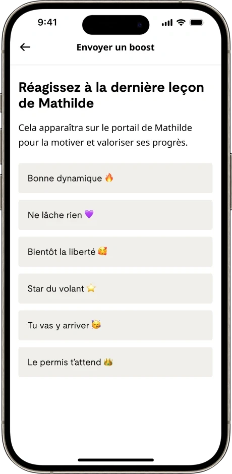 Le parent a l'opportunité de féliciter son enfant grâce à l'envoi d'un boost, avec différentes phrases d'encouragement et d’emojis.